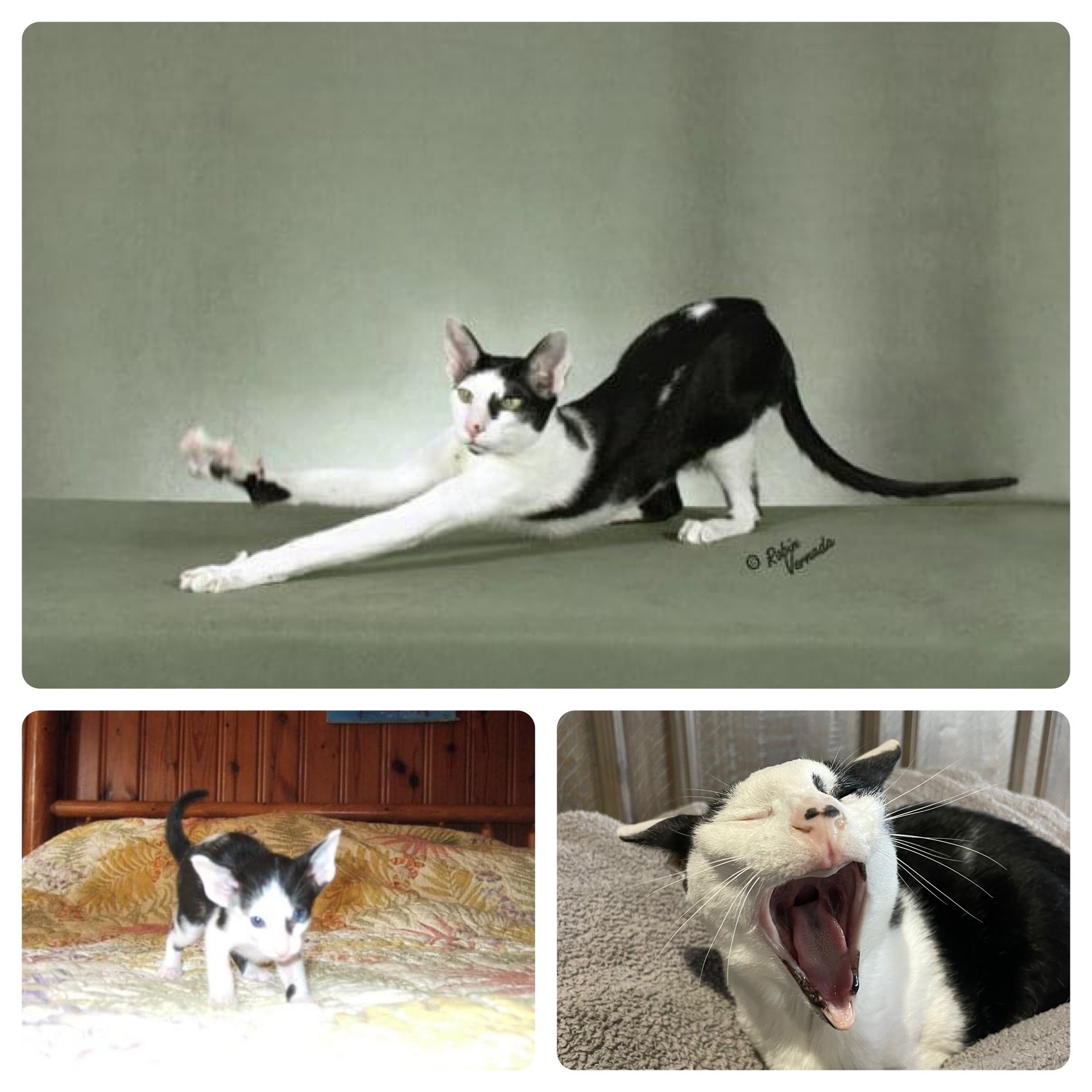 Squid & Sangria always have so much to say, they are Oriental Shorthairs. Squid is 8 and Sangria is 12 years old. Squid is fearful of loud noises, and we make sure he always has a safe space to feel secure. Sangria is always the first to greet strangers. Sangria has a condition called Progressive retinal atrophy, it is hereditary in Oriental Shorthairs and causes vision loss. She can still see, but we have had to make environmental adjustments to ensure she does not injure herself in dark spaces. Her mobility has also decreased, and she can’t jump as high and is not as sure of herself as she used to be, so we make sure there are stairs to navigate to vertical spaces.